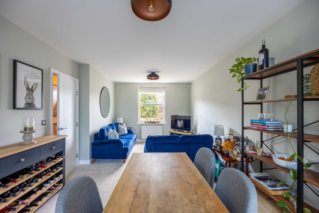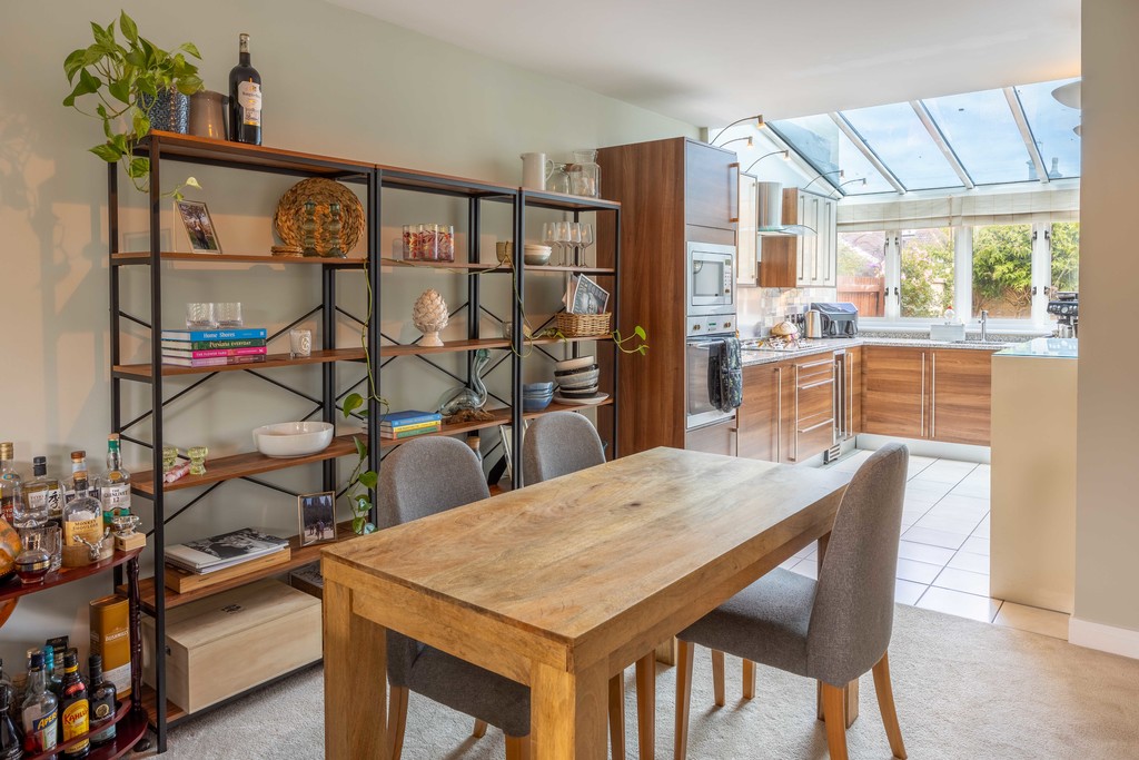 The kitchen is contemporary and stylish, with dark units and glazed roof. Amongst the appliances are a Smeg oven, microwave and gas hob and built-in fridge and dishwasher. The utility room alongside includes a washer-drier and freezer and offers a valuable extra space leading to the downstairs cloakroom.