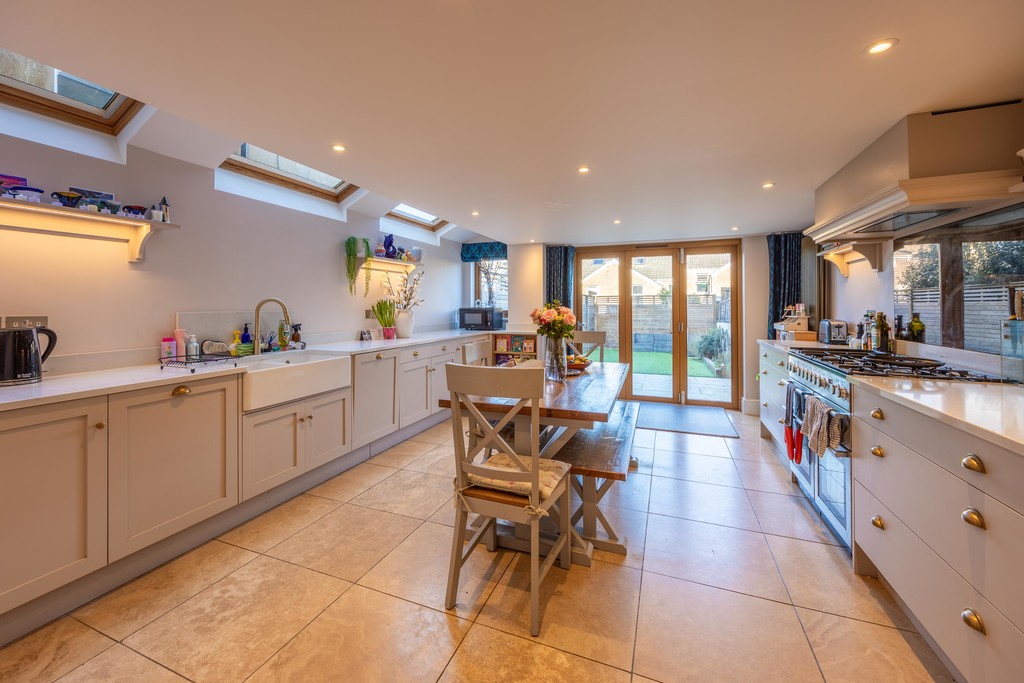 Basement Level: At lower ground floor level, the basement has been fully converted to present a stunning, open-plan kitchen/dining room. This room has been extended sideways to give exceptional space for cooking and dining and also can accommodate a sofa. It comprises a bespoke Shaker and May kitchen and includes a wonderful 110cm, 6-burner Rangemaster range cooker, double Belfast sinks and Travertine flooring, under Velux windows and with bi-fold doors to the garden.