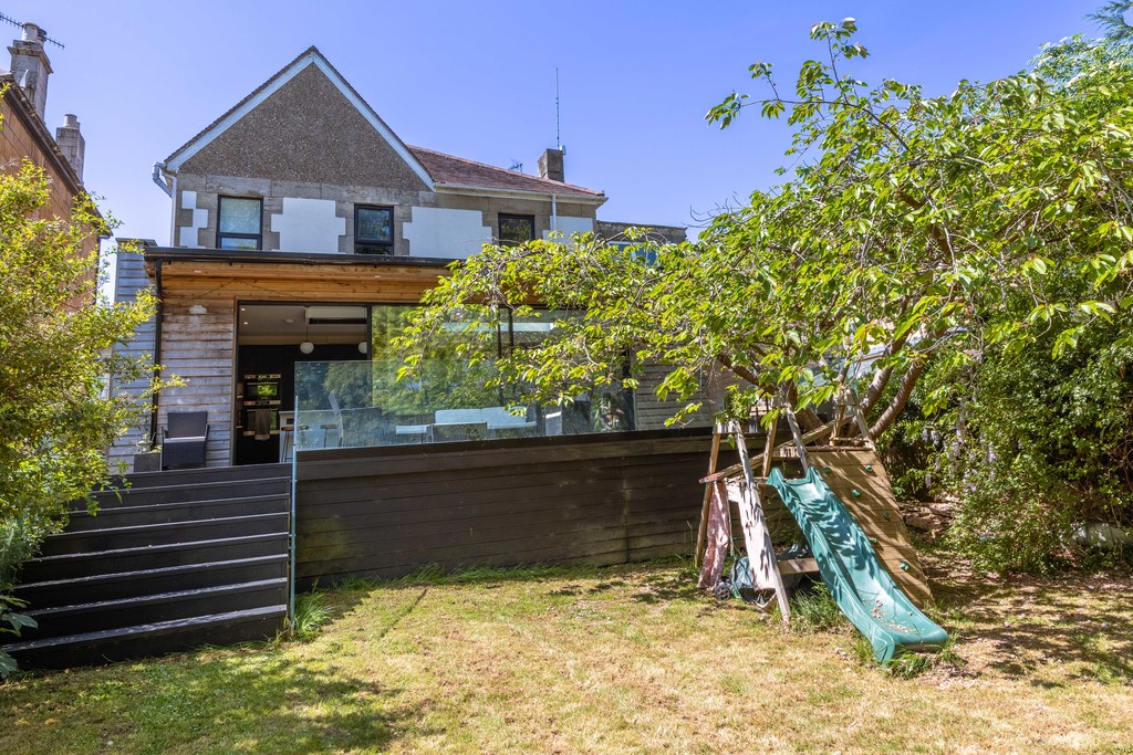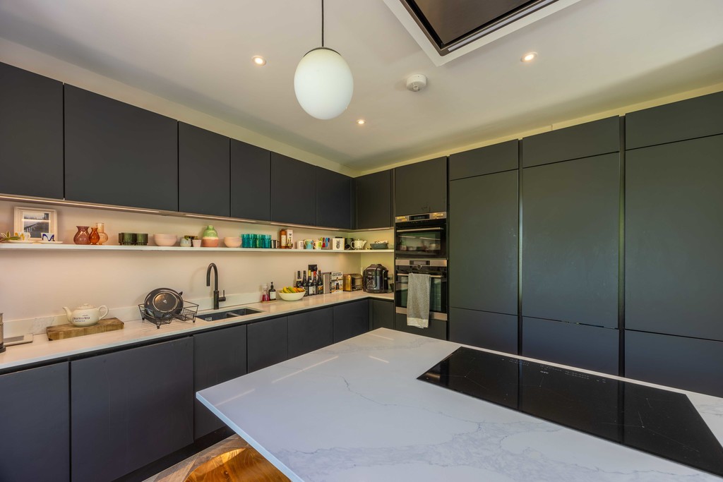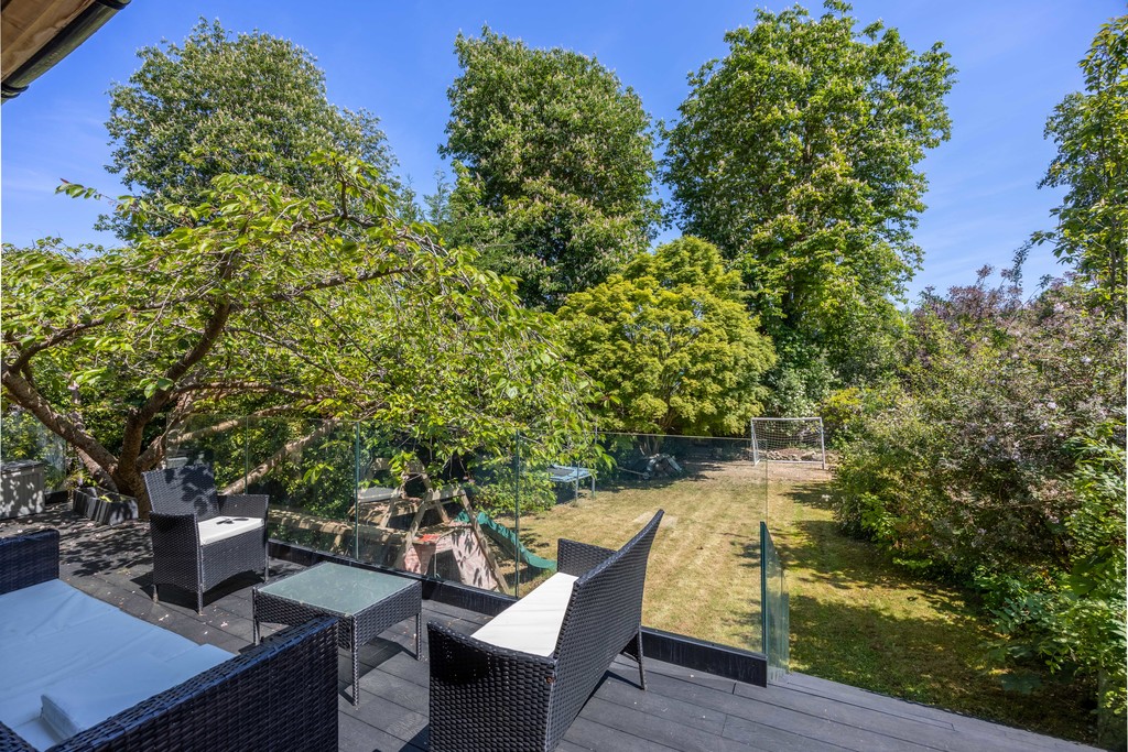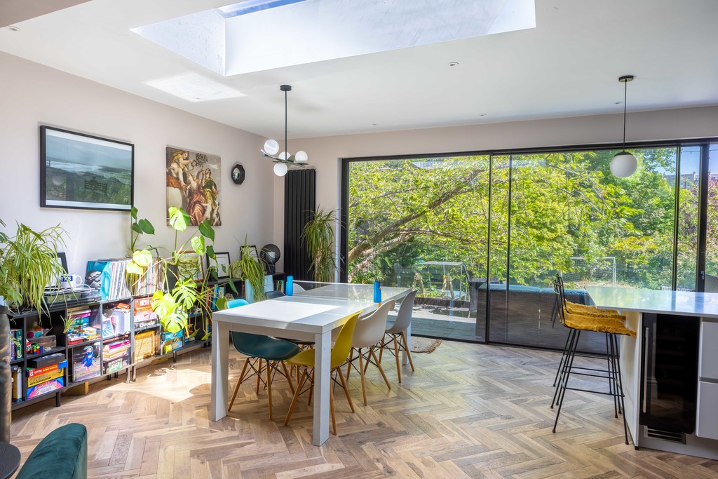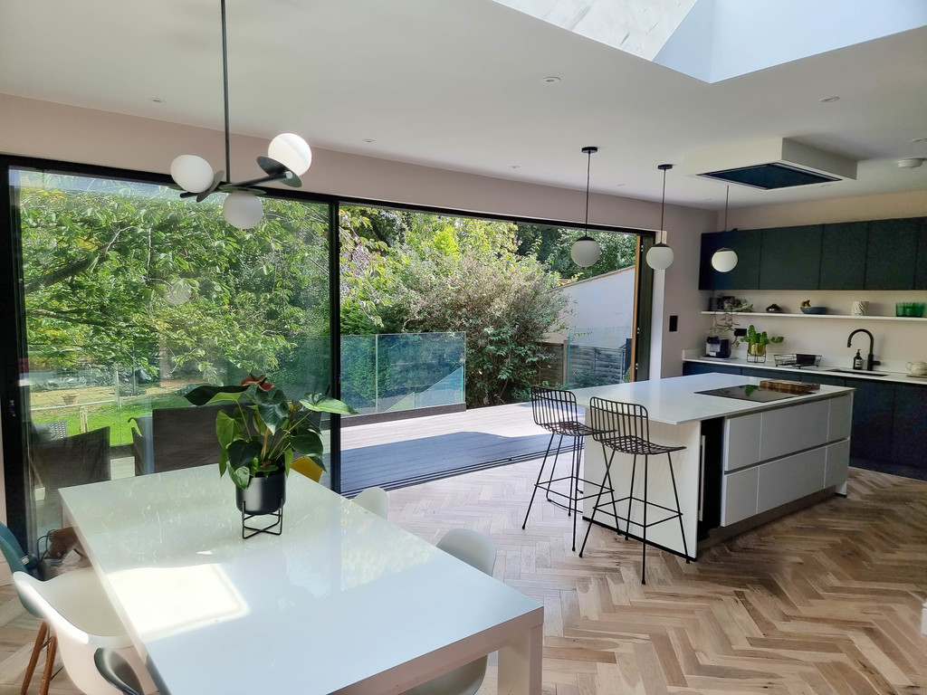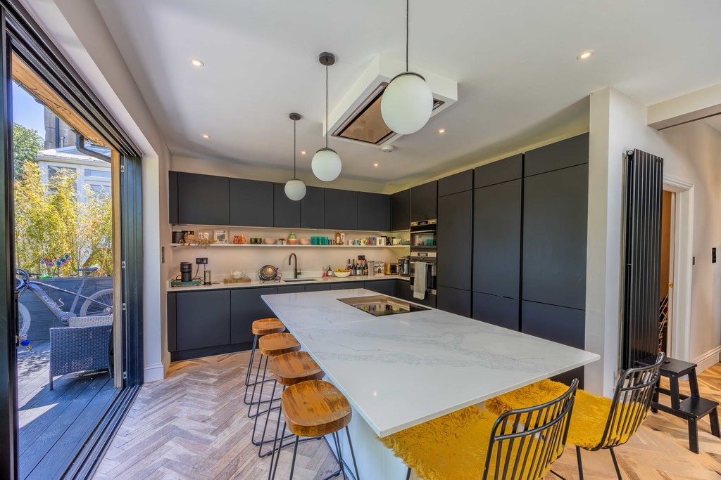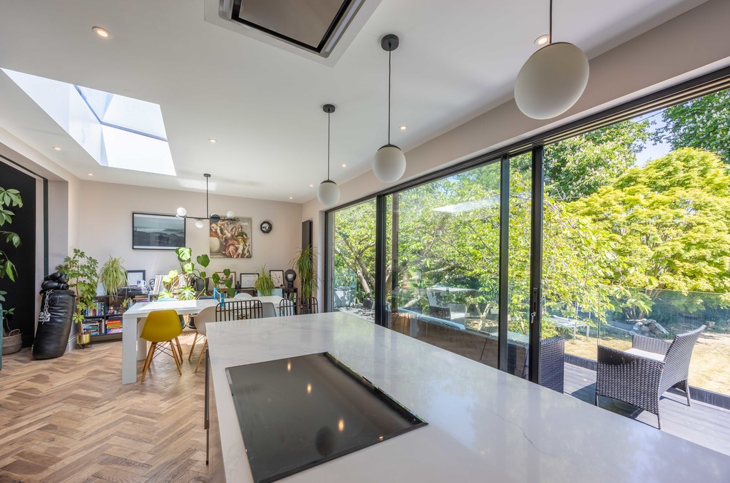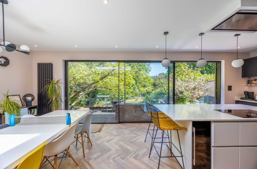 Three oversized sliding doors (with a slimline elegant sliding system) open to the rear decked, raised seating area which then leads down to the garden. With the doors open, the garden flows seamlessly from this lovely rear living space.