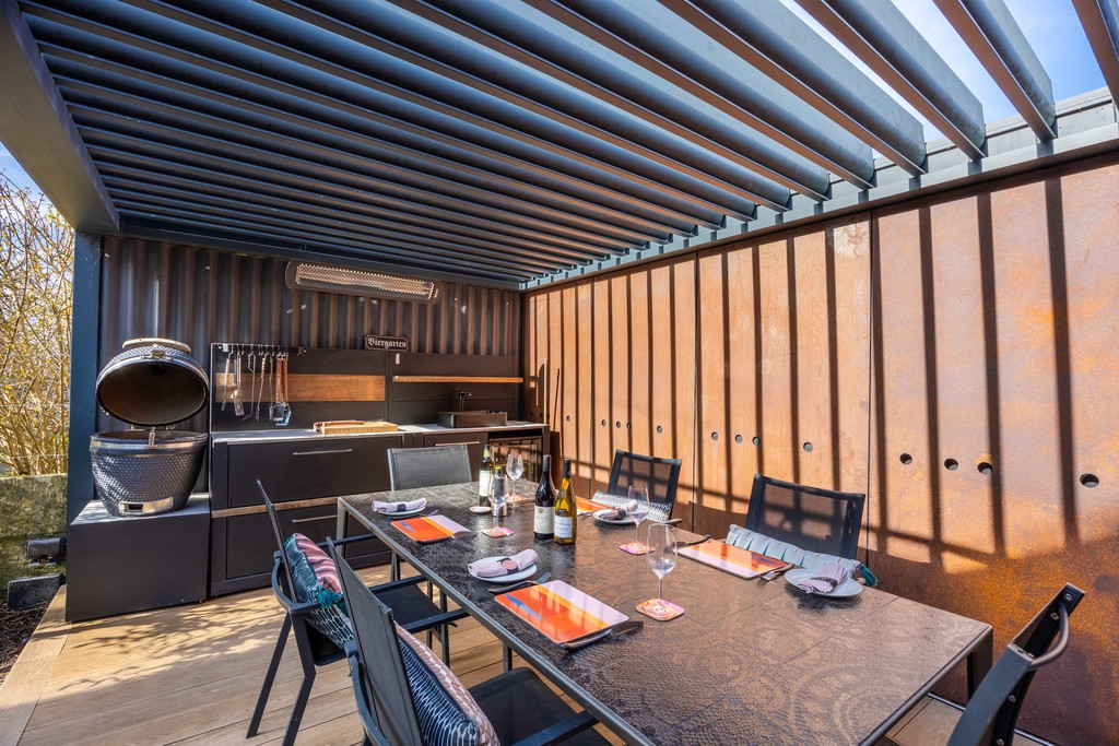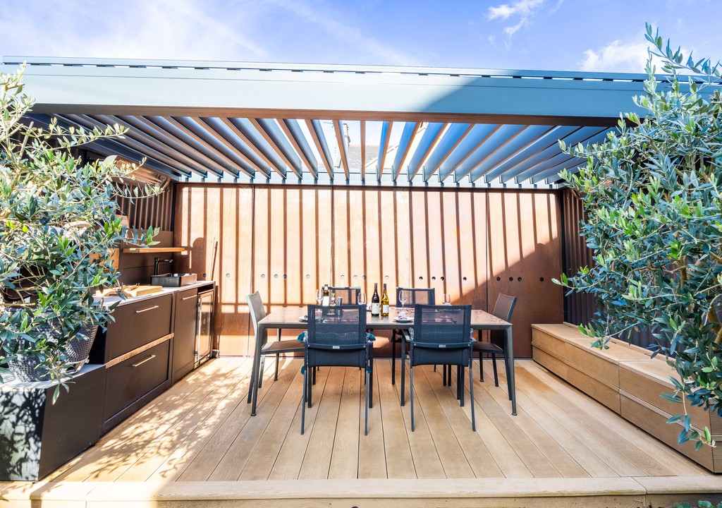 Outside: The beautiful rear garden is landscaped by garden architect Anne Keenen blending stunning use of natural materials such as Mandarin stone slabs and brickwork insets. There are easy maintenance planted areas, ornamental trees and bespoke seating, along with a unique all year-round pergola with infra-red heaters, remote controlled louvred and illuminated roof and well-designed outdoor kitchen including sink and space for fridge and BBQ. The front garden comprises a tiled path to the front door with a neat, shingled area with olive tree and custom-built bike/bin store with power and lighting.