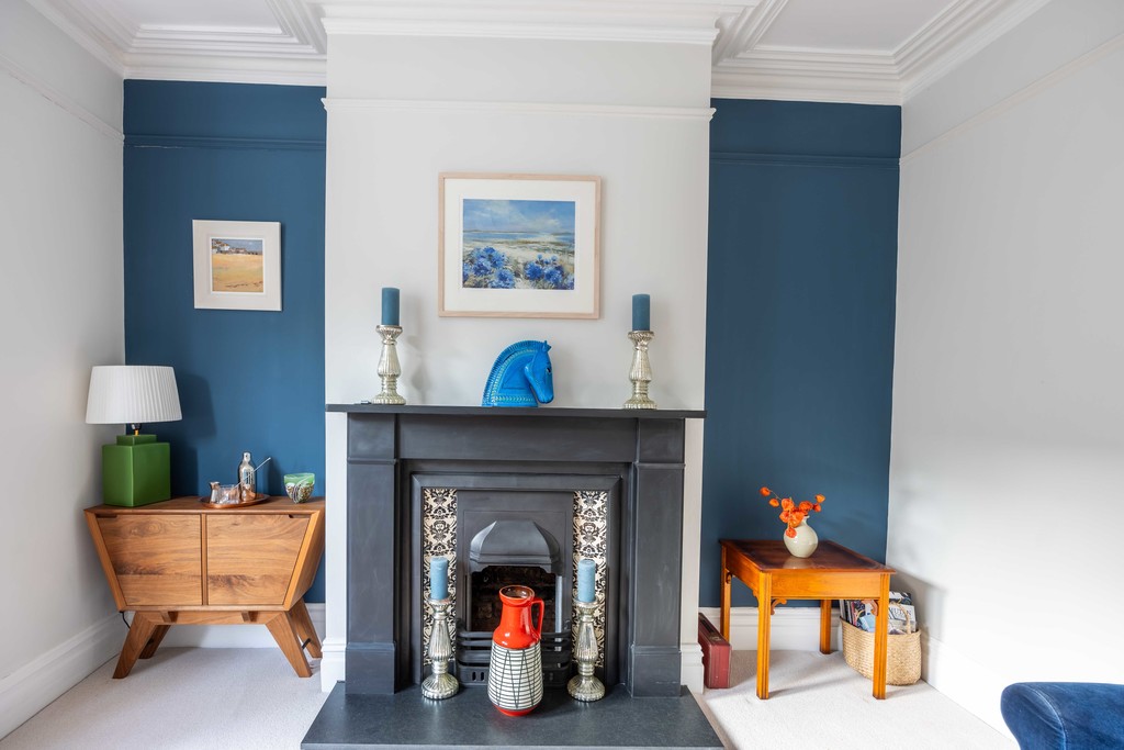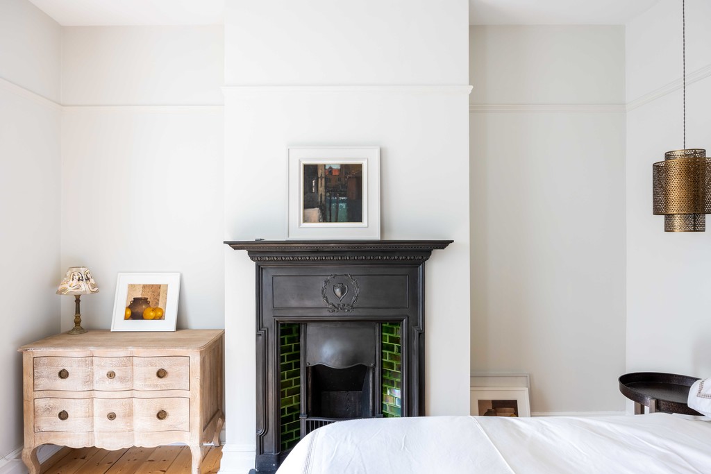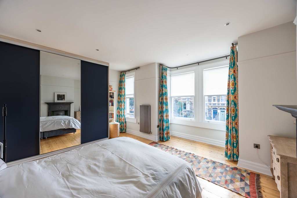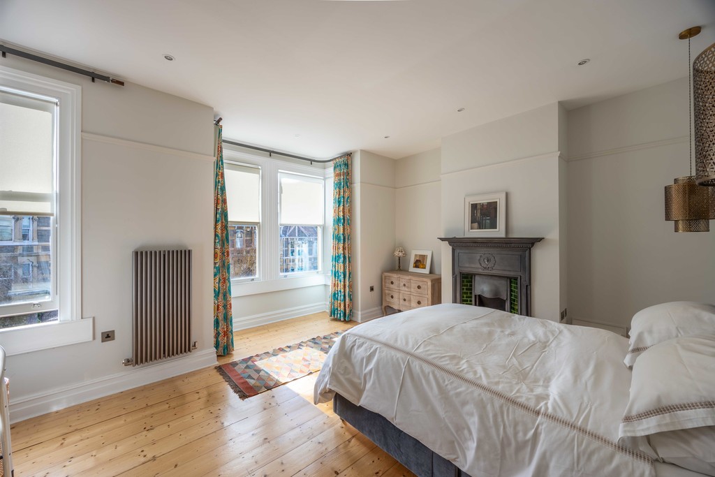 First Floor: Upstairs there are 3 double bedrooms, a shower-room and family bathroom. Bedroom 1 (to the front of the house) is beautifully light filled with a double-glazed, large square bay window, built in wardrobes and cast-iron fireplace.