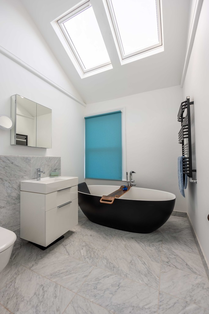 The bathroom and shower-room are alongside one another and have the benefits of underfloor heating and extended ceiling height with Velux windows to let in lots of light. Both are tiled with Mandarin stone marble. The smaller shower room houses a Hansgrohe rainmaker deluge shower, modern white WC and basin, whilst the family bathroom has a Victoria and Albert Barcelona bathtub with shower attachment, white basin and WC and heated towel rail. Altogether, there is a real feeling of quality here,