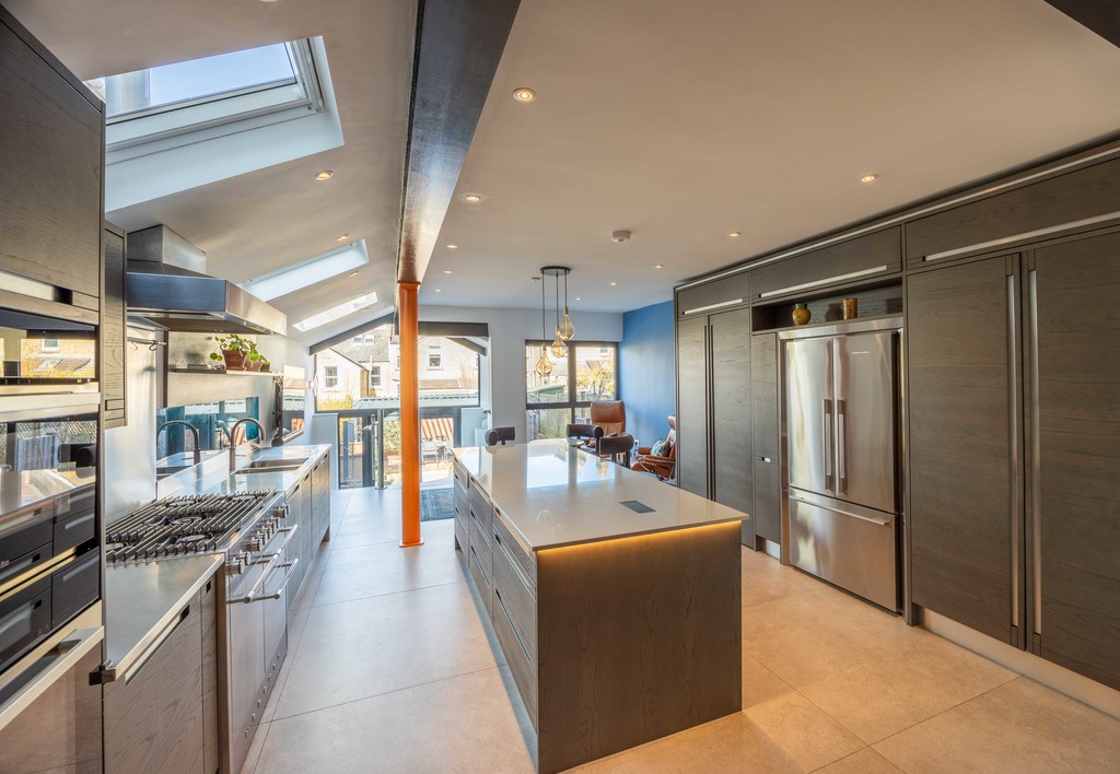 Across the kitchen are further units housing a large Fisher & Paykel fridge/freezer, space for a washing machine and dryer and useful larder storage cupboards. There is also a large central island with Corian worktop and further storage cupboards. To the rear of kitchen there is a snug seating area with space and bracketing for a large wall-mounted tv. From here, steps lead down to a rear lobby leading to the garden, housing the boiler and useful undercroft storage with pressurized hot water tank and water softener. The industrial-style stainless steel rail and glazing bring urban style to the kitchen.