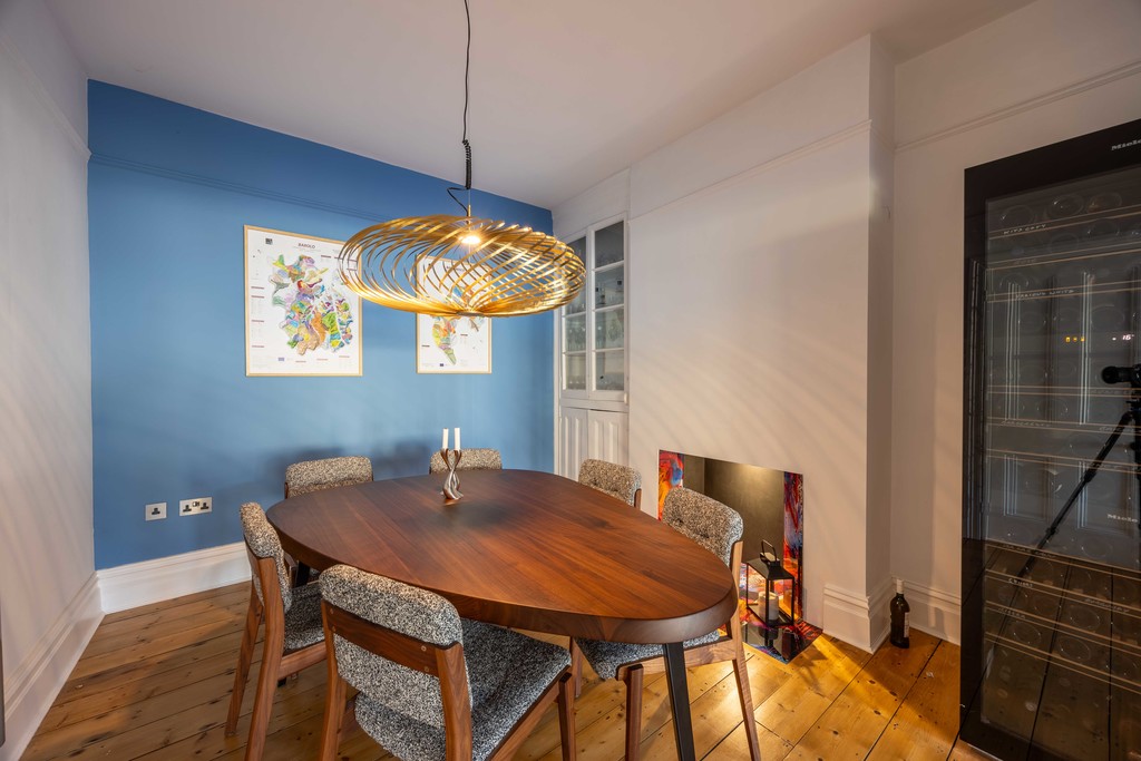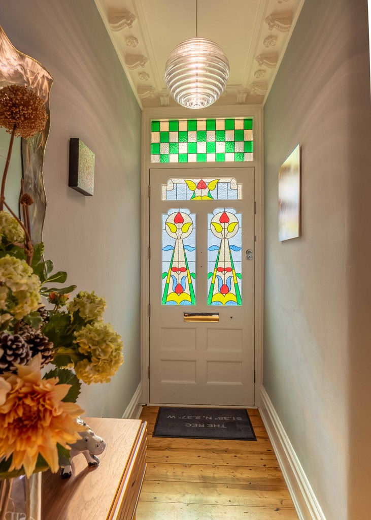 Ground floor: The original Edwardian green tiled vestibule frames the beautiful stained glass paneled front door which leads into the hallway and reception rooms. There is a wonderfully light sitting room to the front with large-double glazed square bay windows and a striking tiled fireplace.