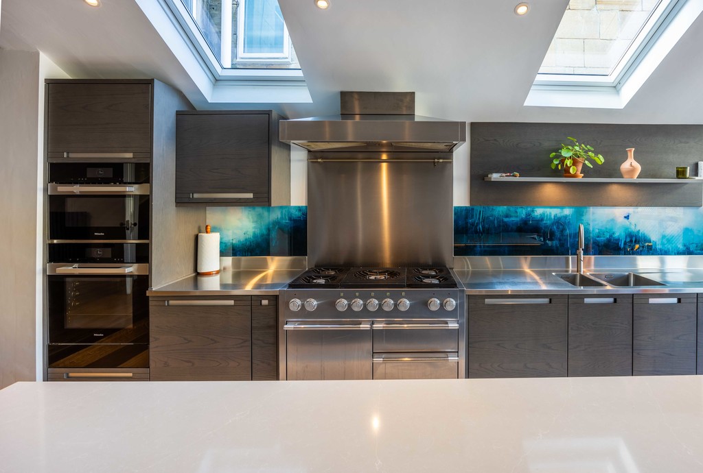 The left wall is flanked by a range of fitted kitchen units with stainless steel worktops and bespoke glass splash backs. There is an integrated Miele convection/steam oven and microwave, vacuum drawer and dishwasher along with a Mercury range cooker (with hood over) and double sink with Quooker tap.