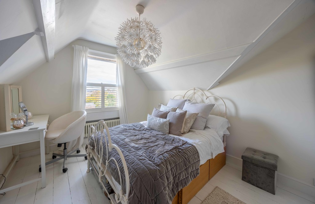 Second Floor: At attic level, there are 2 further double bedrooms set off the small landing, each with white painted floorboards, characterful ceiling eaves and plantation shutters. There are lovely views from both bedrooms.