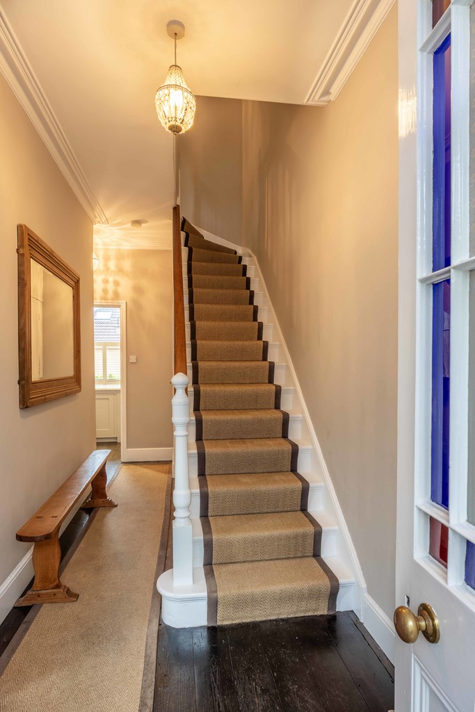 We begin with the beautiful stained glass entrance porch, opening to the hallway. From here, the large sitting room features an ornate ceiling cornice and rose, an open fire with marble surround and sashed bay window.