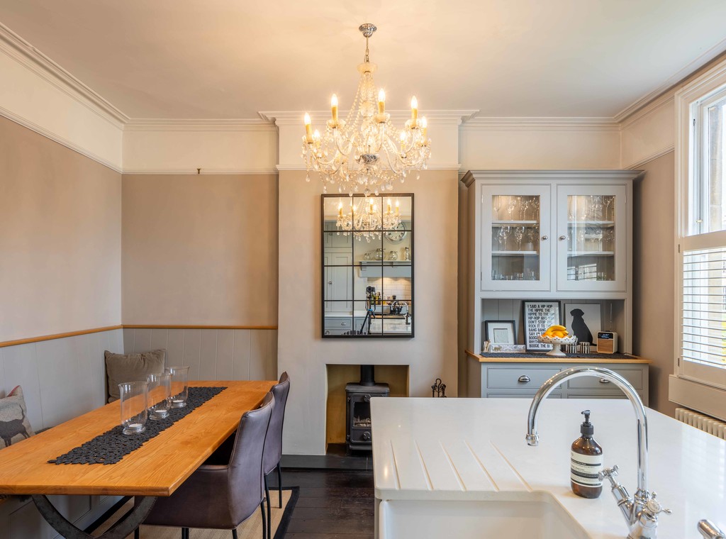 The dining area is fitted with banquette seating, perfect for family mealtimes and a cosy log-burner. Finally, there is the bonus of a rear utility room (with further cabinets and basin) and a downstairs cloakroom.
